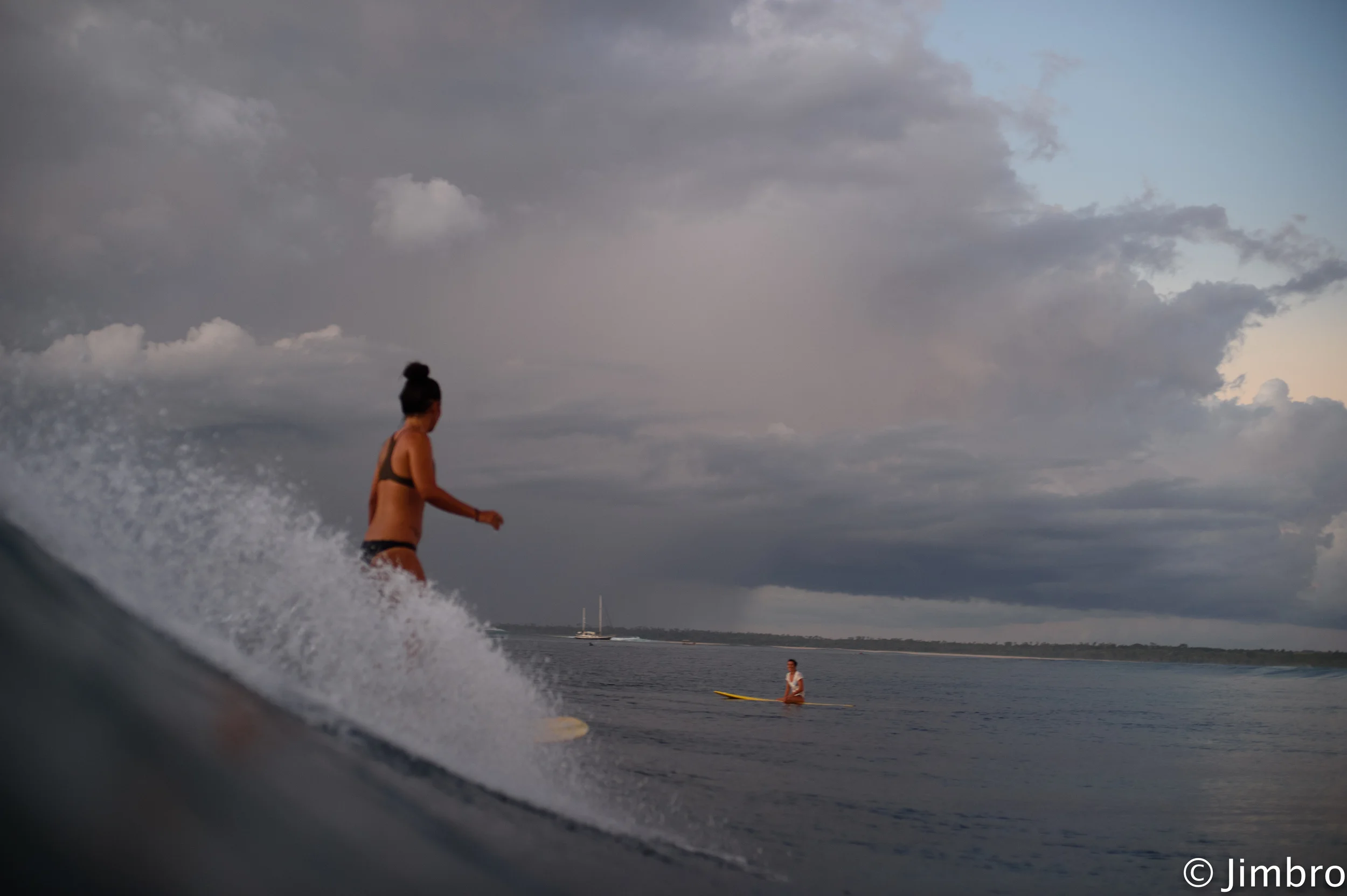 Longboards are hard to come by in unpopulated areas. The first night Janice and Chiara were on Rote they bumped into a man from Kaua'i who rented them his longboards for $10 a day. Janice got to ride his 9'0" Gerry Lopez board for the week!